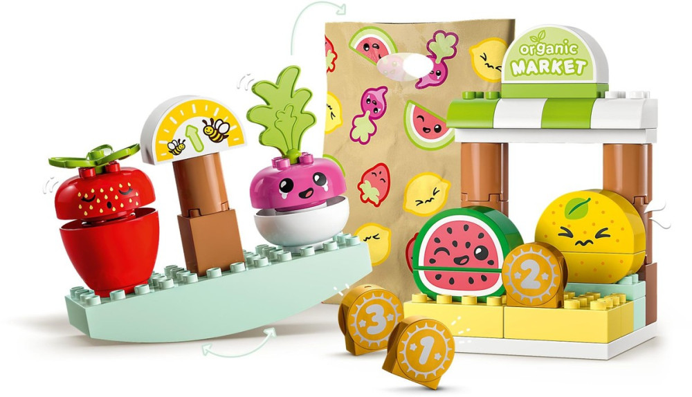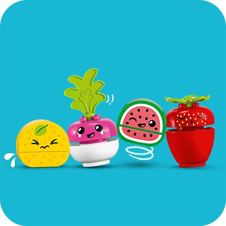 A retek, eper, citrom és dinnye egymásra pakolásával a gyerekek megismerkednek az egyensúlyozással. Minden LEGO DUPLO készlet úgy készült, hogy fejlesszék az önkifejezést – ebben a szettben például minden étel különböző arckifejezéssel van ellátva, hogy életre keltsék a kreatív játékot!